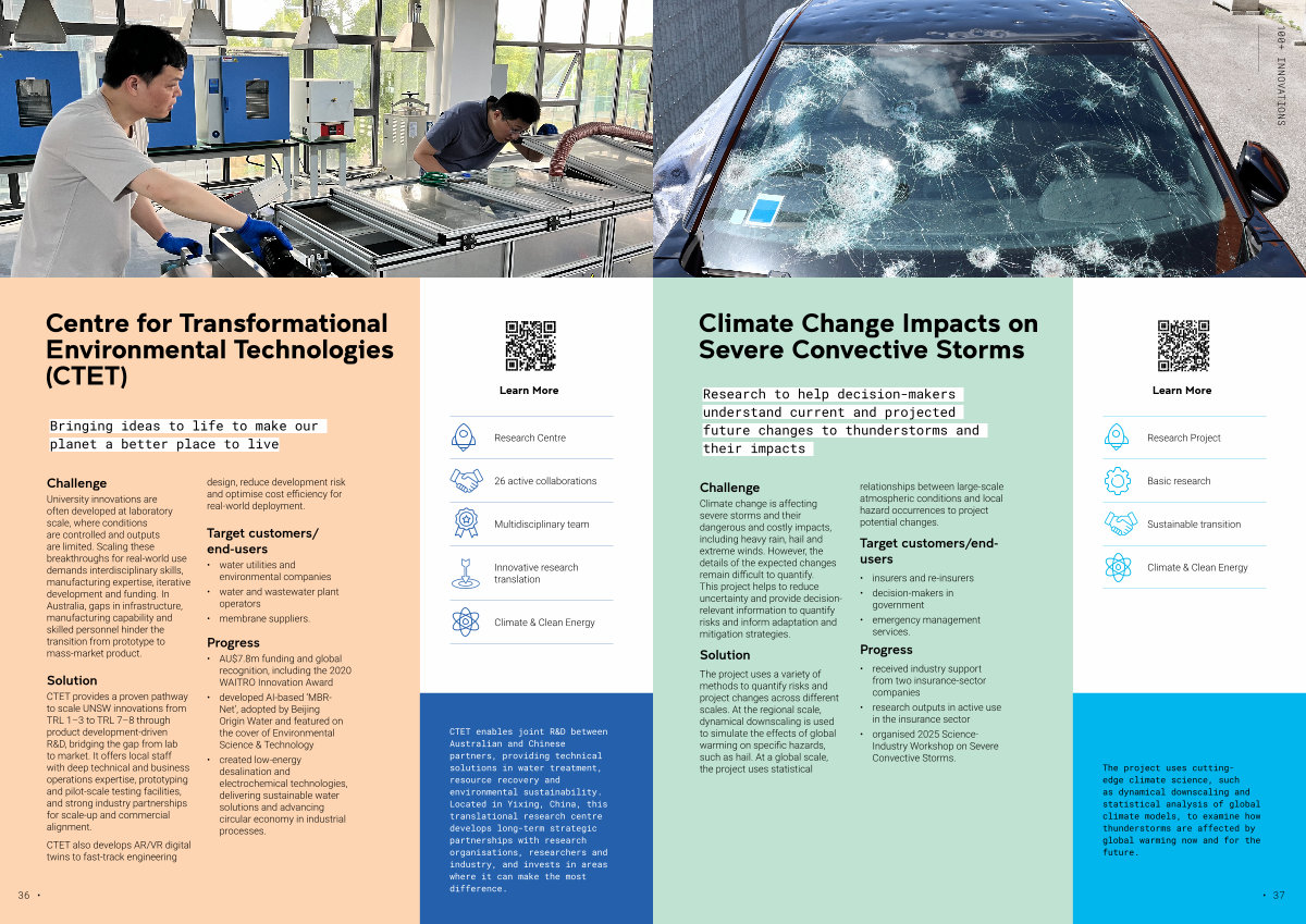 CTET provides a proven pathway to scale UNSW innovations from TRL 1 – 3 to TRL 7 – 8 through product development-driven R & D, bridging the gap from lab to market. It offers local staff with deep technical and business operations expertise, prototyping and pilot-scale testing facilities, and strong industry partnerships for scale-up and commercial alignment.