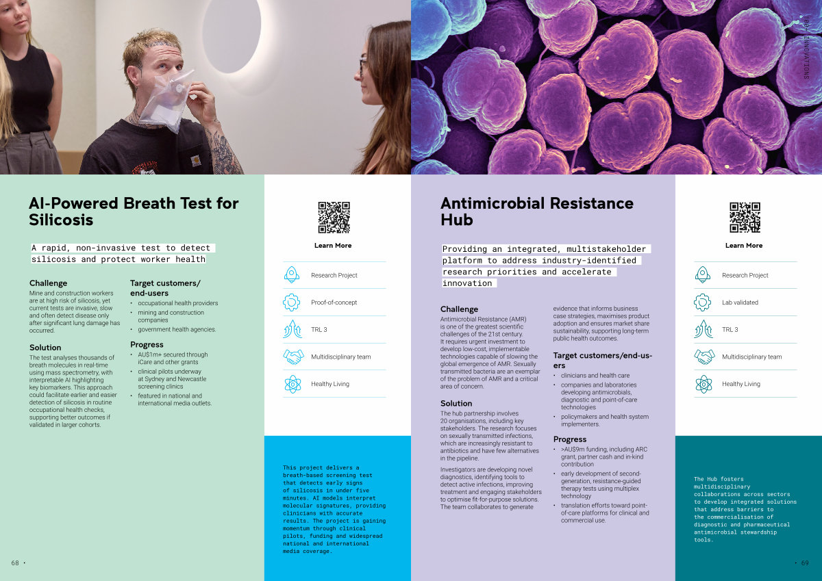 This project delivers a breath-based screening test that detects early signs of silicosis in under five minutes. AI models interpret molecular signatures, providing clinicians with accurate results. The project is gaining momentum through clinical pilots, funding and widespread national and international media coverage.