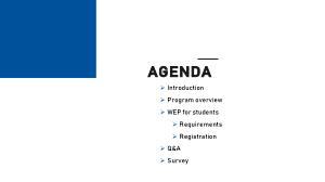AGENDA Ø Introduction Ø Program overview Ø WEP for students Ø Requirements Ø Registration Ø Q & A Ø Survey