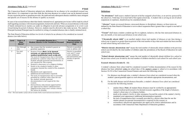 A student ’ s absence from school shall be considered excused if written documentation of the reason for the absence has been submitted within ten school days of the student ’ s return to school or in accordance with Section 10-210 of the Connecticut General Statutes and meets the following criteria :