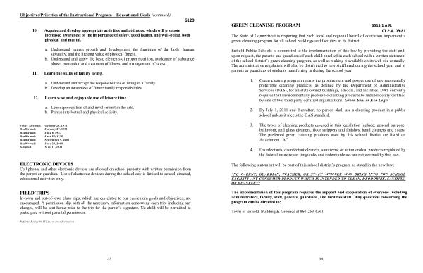 Enfield Public Schools is committed to the implementation of this law by providing the staff and , upon request , the parents and guardians of each child enrolled in each school with a written statement of the school district ’ s green cleaning program , as well as making it available on its web site annually . The administrative regulation will also be distributed to new staff hired during the school year and to parents or guardians of students transferring in during the school year .