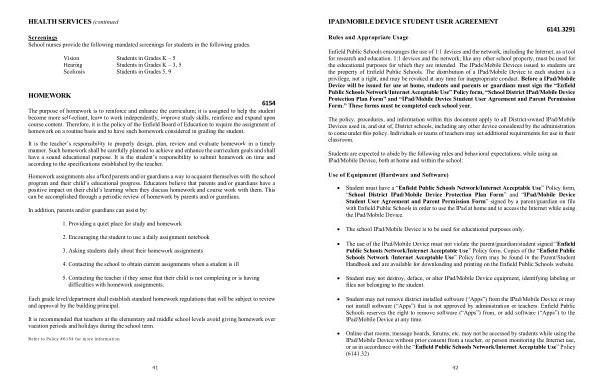 • The use of the IPad / Mobile Device must not violate the parent / guardian / student signed “ Enfield Public Schools Network / Internet Acceptable Use ” Policy form . Copies of the “ Enfield Public Schools Network / Internet Acceptable Use ” Policy form may be found in the Parent / Student Handbook and are available for downloading and printing on the Enfield Public Schools website .