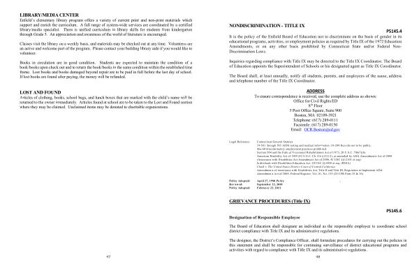 P5145.4 It is the policy of the Enfield Board of Education not to discriminate on the basis of gender in its educational programs , activities , or employment policies as required by Title IX of the 1972 Education Amendments , or on any other basis prohibited by Connecticut State and / or Federal Non- Discrimination Laws .