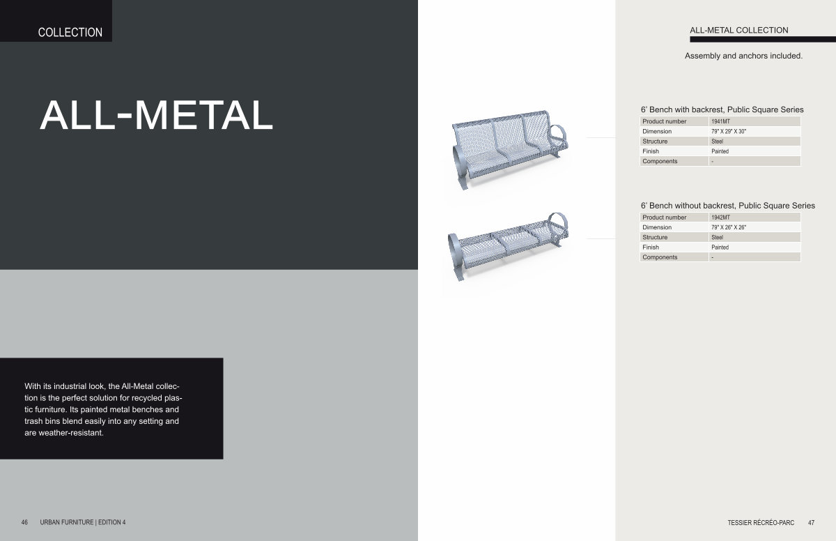 With its industrial look, the All-Metal collection is the perfect solution for recycled plastic furniture. Its painted metal benches and trash bins blend easily into any setting and are weather-resistant.