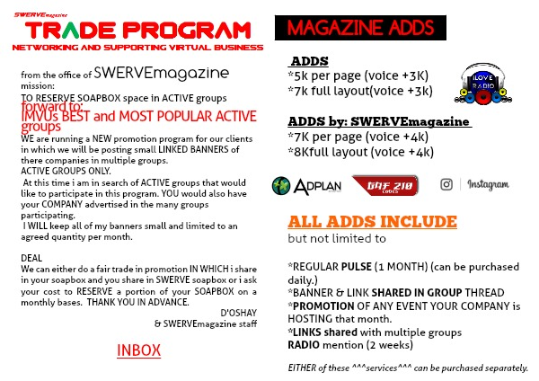 We can either do a fair trade in promotion IN WHICH i share in your soapbox and you share in SWERVE soapbox or i ask your cost to RESERVE a portion of your SOAPBOX on a monthly bases. THANK YOU IN ADVANCE.