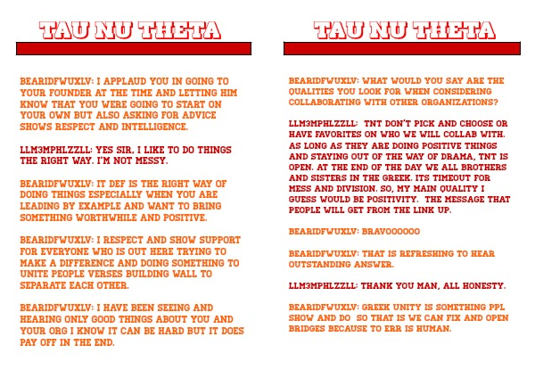 llM3MPHlZzll: TNT don't pick and choose or have favorites on who we will collab with. As long as they are doing positive things and staying out of the way of drama, TNT is open. At the end of the day we all brothers and sisters in the Greek. Its timeout for mess and division. So, my main quality I guess would be positivity. The message that people will get from the link up.