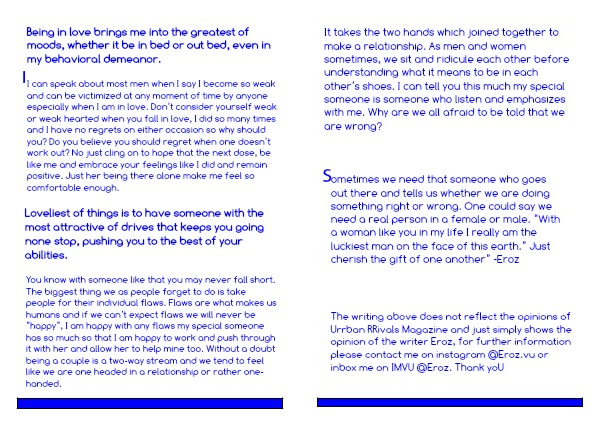 I can speak about most men when I say I become so weak and can be victimized at any moment of time by anyone especially when I am in love. Don’t consider yourself weak or weak hearted when you fall in love, I did so many times and I have no regrets on either occasion so why should you? Do you believe you should regret when one doesn’t work out? No just cling on to hope that the next dose, be like me and embrace your feelings like I did and remain positive. Just her being there alone make me feel so comfortable enough.