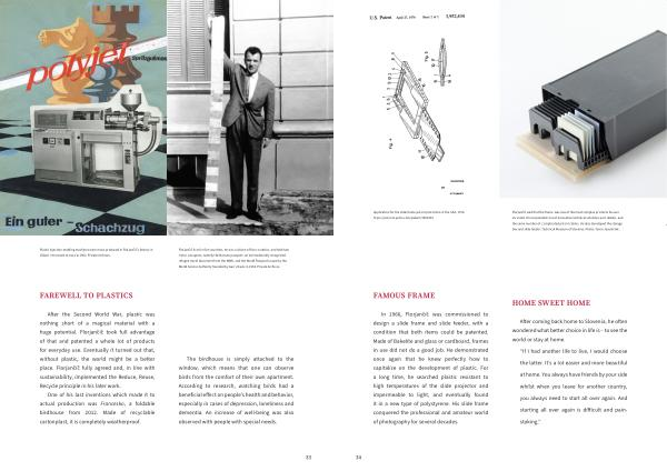 In 1966 , Florjančič was commissioned to design a slide frame and slide feeder , with a condition that both items could be patented . Made of Bakelite and glass or cardboard , frames in use did not do a good job . He demonstrated once again that he knew perfectly how to capitalize on the development of plastic . For a long time , he searched plastic resistant to high temperatures of the slide projector and impermeable to light , and eventually found it in a new type of polystyrene . His slide frame conquered the professional and amateur world of photography for several decades .