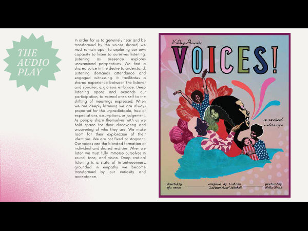In order for us to genuinely hear and be transformed by the voices shared, we must remain open to exploring our own capacity to listen to ourselves listening. Listening as presence explores unexamined perspectives. We find a shared voice in the desire to understand. Listening demands attendance and engaged witnessing. It facilitates a shared experience between the listener and speaker, a glorious embrace. Deep listening opens and expands our participation, to extend one’ s self to the shifting of meanings expressed. When we are deeply listening we are always prepared for the unpredictable, free of expectations, assumptions, or judgement. As people share themselves with us we hold space for their discovering and uncovering of who they are. We make room for their exploration of their identities. We are not fixed or stagnant. Our voices are the blended formation of individual and shared realities. When we listen we must fully immerse ourselves in sound, tone, and vision. Deep radical listening is a state of in-betweenness, grounded in empathy we become transformed by our curiosity and acceptance.