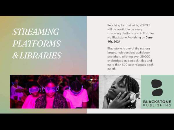 Reaching far and wide, VOICES will be available on every streaming platform and in libraries via Blackstone Publishing on June 4th, 2024.