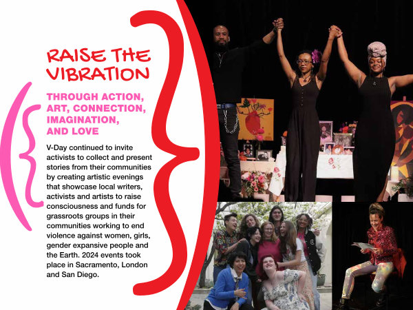V-Day continued to invite activists to collect and present stories from their communities by creating artistic evenings that showcase local writers, activists and artists to raise consciousness and funds for grassroots groups in their communities working to end violence against women, girls, gender expansive people and the Earth. 2024 events took place in Sacramento, London and San Diego.