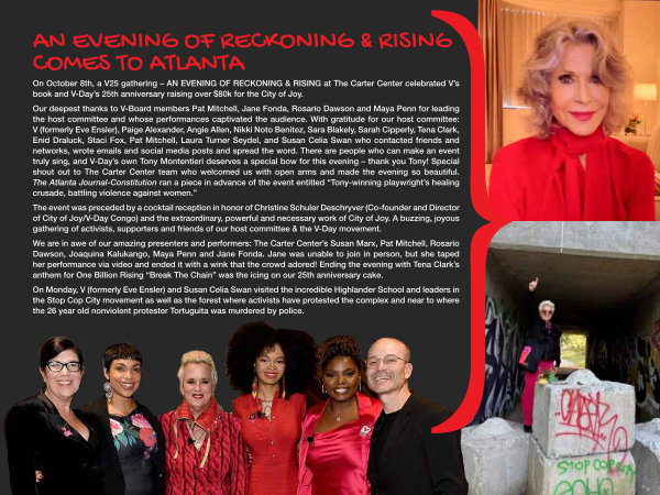 On October 8th, a V25 gathering – AN EVENING OF RECKONING & RISING at The Carter Center celebrated V’ s book and V-Day’ s 25th anniversary raising over $ 80k for the City of Joy.