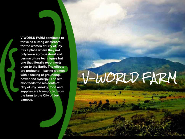 V-WORLD FARM continues to thrive as a living classroom for the women of City of Joy. It is a place where they not only learn agro-pastoral and permaculture techniques but one that literally reconnects them to the Earth. The effects are profound – leaving women with a feeling of grounding, power and synergy. The site also feeds the residents of City of Joy. Weekly, food and supplies are transported from the farm to the City of Joy campus.