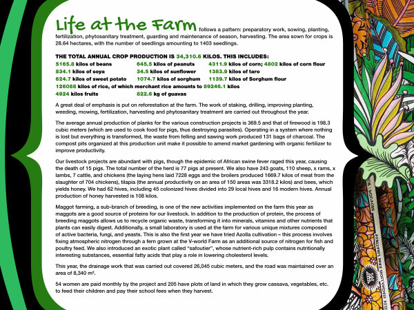 Maggot farming, a sub-branch of breeding, is one of the new activities implemented on the farm this year as maggots are a good source of proteins for our livestock. In addition to the production of protein, the process of breeding maggots allows us to recycle organic waste, transforming it into minerals, vitamins and other nutrients that plants can easily digest. Additionally, a small laboratory is used at the farm for various unique mixtures composed of active bacteria, fungi, and yeasts. This is also the first year we have tried Azolla cultivation – this process involves fixing atmospheric nitrogen through a fern grown at the V-world Farm as an additional source of nitrogen for fish and poultry feed. We also introduced an exotic plant called“ safoutier”, whose nutrient-rich pulp contains nutritionally interesting substances, essential fatty acids that play a role in lowering cholesterol levels.