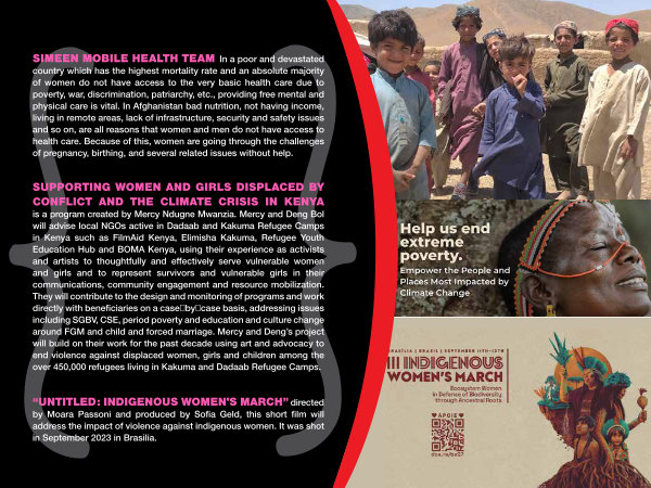 SUPPORTING WOMEN AND GIRLS DISPLACED BY CONFLICT AND THE CLIMATE CRISIS IN KENYA is a program created by Mercy Ndugne Mwanzia. Mercy and Deng Bol will advise local NGOs active in Dadaab and Kakuma Refugee Camps in Kenya such as FilmAid Kenya, Elimisha Kakuma, Refugee Youth Education Hub and BOMA Kenya, using their experience as activists and artists to thoughtfully and effectively serve vulnerable women and girls and to represent survivors and vulnerable girls in their communications, community engagement and resource mobilization. They will contribute to the design and monitoring of programs and work directly with beneficiaries on a case‐by‐case basis, addressing issues including SGBV, CSE, period poverty and education and culture change around FGM and child and forced marriage. Mercy and Deng’ s project will build on their work for the past decade using art and advocacy to end violence against displaced women, girls and children among the over 450,000 refugees living in Kakuma and Dadaab Refugee Camps.