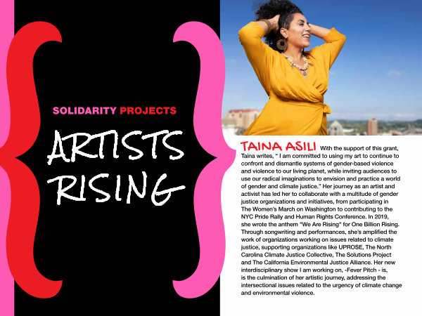 TAINA ASILI With the support of this grant, Taina writes,“ I am committed to using my art to continue to confront and dismantle systems of gender-based violence and violence to our living planet, while inviting audiences to use our radical imaginations to envision and practice a world of gender and climate justice.” Her journey as an artist and activist has led her to collaborate with a multitude of gender justice organizations and initiatives, from participating in The Women’ s March on Washington to contributing to the NYC Pride Rally and Human Rights Conference. In 2019, she wrote the anthem " We Are Rising " for One Billion Rising. Through songwriting and performances, she’ s amplified the work of organizations working on issues related to climate justice, supporting organizations like UPROSE, The North Carolina Climate Justice Collective, The Solutions Project and The California Environmental Justice Alliance. Her new interdisciplinary show I am working on,-Fever Pitch- is, is the culmination of her artistic journey, addressing the intersectional issues related to the urgency of climate change and environmental violence.