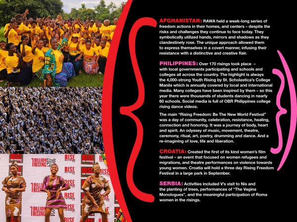 CROATIA: Created the first of its kind women’ s film festival – an event that focused on women refugees and migrations, and theatre performances on violence towards young women. Croatia will hold a three day Rising Freedom Festival in a large park in September.