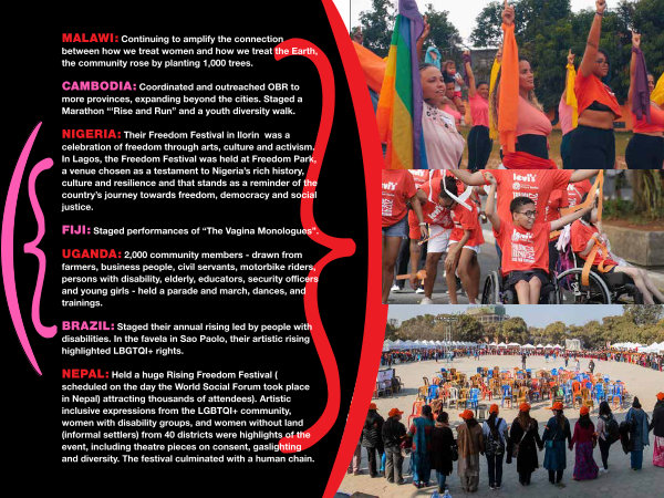 NEPAL: Held a huge Rising Freedom Festival( scheduled on the day the World Social Forum took place in Nepal) attracting thousands of attendees). Artistic inclusive expressions from the LGBTQI + community, women with disability groups, and women without land( informal settlers) from 40 districts were highlights of the event, including theatre pieces on consent, gaslighting and diversity. The festival culminated with a human chain.