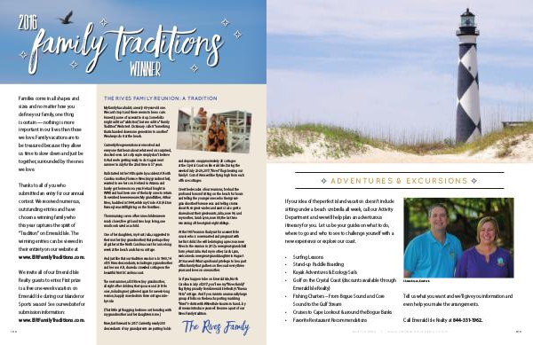 Thanks to all of you who submitted an entry for our annual contest. We received numerous, outstanding entries and have chosen a winning family who this year captures the spirit of“ Tradition” on Emerald Isle. The winning entries can be viewed in their entirety on our website at www. EIRFamilyTraditions. com.