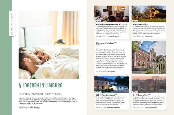 Logeren in Limburg , da ’ s pure gastvrijheid . Een persoonlijke verwelkoming , een huiselijk kader , comfortabele bedden , een verzorgd ontbijt , toeristische tips en persoonlijke verhalen : hier is het als thuiskomen , zij het met wat extra verwennerij ! Via de kaart op pagina 6 kan je makkelijk de logies per regio situeren .