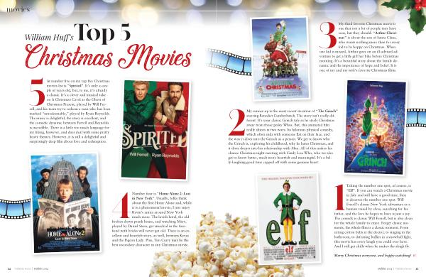 1Taking the number one spot , of course , is “ Elf ”. If you can watch a Christmas movie in July and still have a good time , then it deserves the number one spot . Will Ferrell ’ s classic New York adventure as a human raised by elves , searching for his father , and the love he hopes to have is just a joy . The comedy is classic Will Ferrell , but is also clean for the whole family to enjoy . Forget classic moments , the whole film is a classic moment . From eating cotton balls at the doctor , to singing in the bathroom , to defeating bullies in a snowball fight , this movie has every laugh you could ever have . And I still get chills when he makes the sleigh fly .