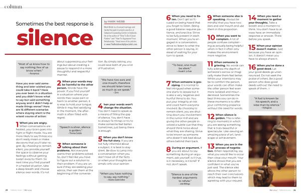 6When you need to listen . Don ’ t get so focused on being heard that you forget to listen . Being a good listener requires patience , and practice . Strive to be fully present in each moment . When you ’ re engaged in a conversation , strive to listen to what the other person is saying , instead of waiting for your turn to speak . “ To hear , one must be silent .”