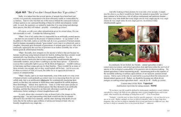 * Fact : Finally , and by far most importantly , even if this myth were true ; even if farmed animals would gradually go extinct were we to stop using them for our own selfish ends , that is no justification whatsoever for systematically murdering them merely so that they can continue to fulfill those same superficial & selfish purposes . How disturbingly – indeed , how repulsively – ironic it is that meat-eaters profess to be concerned for the survival of farmed species that they themselves are artificially breeding , and that they themselves are then only allowing to reach the age of adolescence before sending to a brutal slaughterhouse end !
