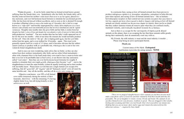 And in case you were wondering , male calves fare no better , as they are also stolen from their mothers immediately after birth , and are either killed immediately – often with a hammer blow to the head ( male dairy cows tend to have a meat-to-bone ratio that is too low to be profitable later as beef cows ), or are thrown into tiny enclosures called “ veal crates ”. Here they are over-fed hormone-laced formulas for roughly 8 months to stimulate their own rapid growth , whereupon they become “ veal ” – sent to the slaughterhouse to meet the same brutally violent & equally terrifying end as their mother will inevitably know . Please know as well that not a single farmed cow escapes this suffering ; that all “ grass fed ”, all “ organic ” and all “ humanely raised ” cows all meet the same horrible end – they all die terribly , and they all do so at a very young age .