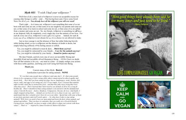 “ It ’ s not that some people have willpower and some don ’ t . It ’ s that some people choose to be courageous in their caring while others remain mired in ethical apathy and moral sloth … How did I go from eating hot dogs , bacon , hamburgers , steak , chicken , fish , cheese , milk , and eggs to not eating any of it ? It was simple . First , I learned that animals suffer terribly when they ' re turned into food – and that they fully enjoy living their lives when they aren ’ t . Then I learned that I don ' t need to eat animals at all to live a long & healthy life . Then I remembered that eating animals is inconsistent with the fundamental values I cherish the most – Justice , Kindness , Compassion , Decency & Love . And finally , I simply stopped eating them … Animals are not here for us to abuse in any way , and I now understand that they certainly aren ’ t here for us to eat either . Spend time with some of them at any farm sanctuary and you ' ll surely agree … So what does it take to stop eating animals ? Well , first you need to have an open-mind and learn the facts about animals and animal agriculture . Then you have to remember that you really are a Good & Kind & Caring person . And finally you have to make a little effort to align your actions with those values … That ' s it .” ~ inspired by James Gordon & Andrew Kirschner