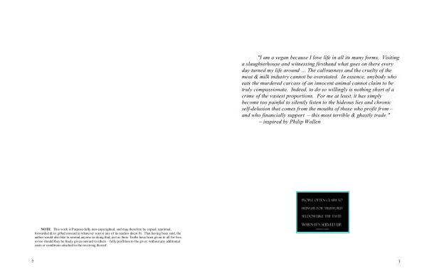 " I am a vegan because I love life in all its many forms . Visiting a slaughterhouse and witnessing firsthand what goes on there every day turned my life around … The callousness and the cruelty of the meat & milk industry cannot be overstated . In essence , anybody who eats the murdered carcass of an innocent animal cannot claim to be truly compassionate . Indeed , to do so willingly is nothing short of a crime of the vastest proportions . For me at least , it has simply become too painful to silently listen to the hideous lies and chronic self-delusion that comes from the mouths of those who profit from – and who financially support – this most terrible & ghastly trade ."