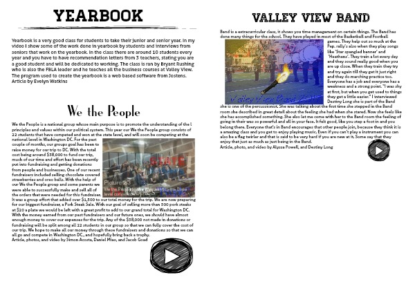Yearbook is a very good class for students to take their junior and senior year. In my video I show some of the work done in yearbook by students and interviews from seniors that work on the yearbook. In the class there are around 10 students every year and you have to have recommendation letters from 3 teachers, stating you are a good student and will be dedicated to working. The class is ran by Bryant Rushing who is also the FBLA leader and he teaches all the business courses at Valley View. The program used to create the yearbook is a web based software from Jostens.