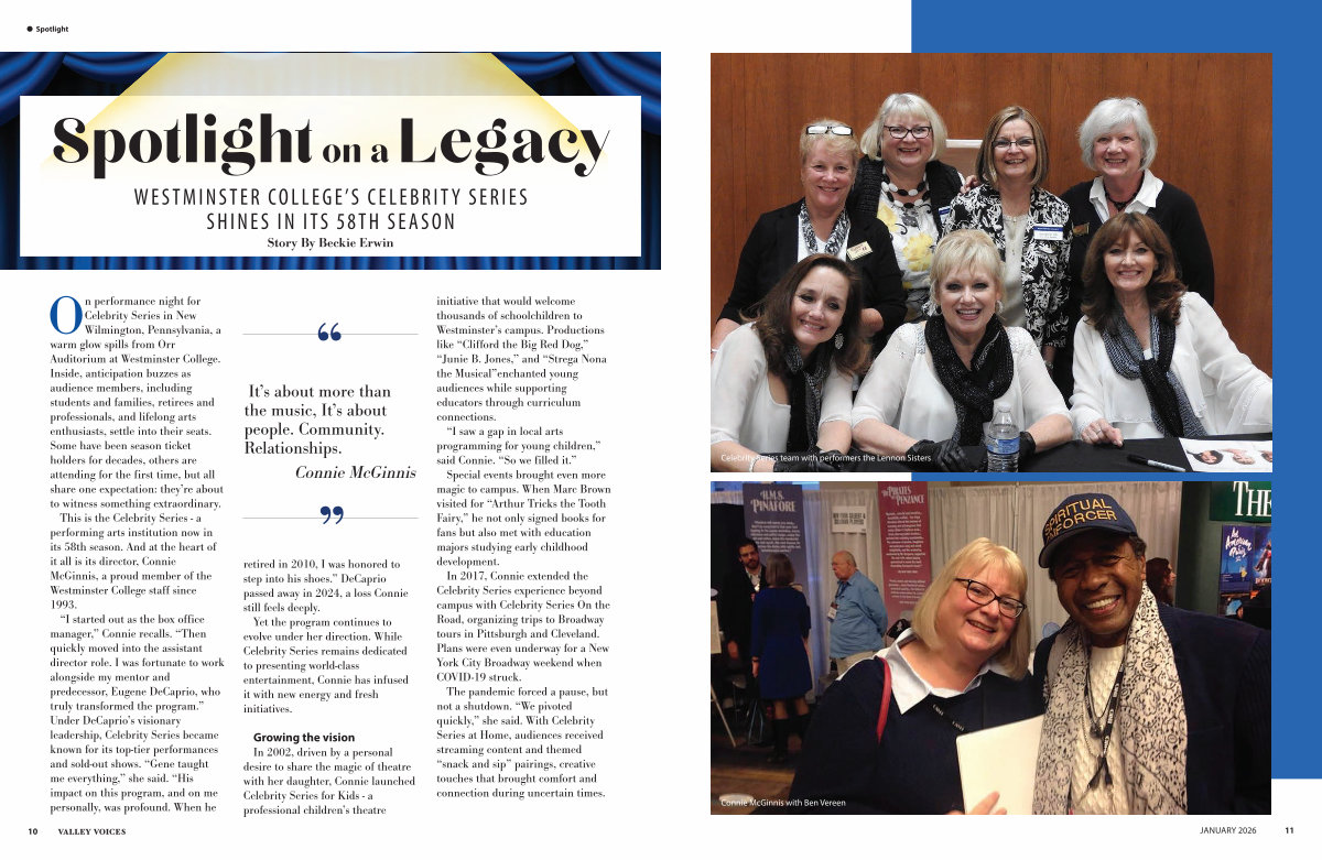 On performance night for Celebrity Series in New Wilmington, Pennsylvania, a warm glow spills from Orr Auditorium at Westminster College. Inside, anticipation buzzes as audience members, including students and families, retirees and professionals, and lifelong arts enthusiasts, settle into their seats. Some have been season ticket holders for decades, others are attending for the first time, but all share one expectation: they’ re about to witness something extraordinary. This is the Celebrity Series- a performing arts institution now in its 58th season. And at the heart of it all is its director, Connie McGinnis, a proud member of the Westminster College staff since 1993.