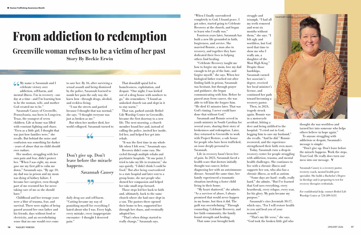 Savannah Causey of Greenville, Pennsylvania, was born in Longview, Texas, the youngest of seven children. Life at home was filled with constant fighting and chaos.“ Even as a little girl, I thought that was just how families were,” she recalls. But behind the noise and confusion was something far darker- years of abuse that no child should ever endure.