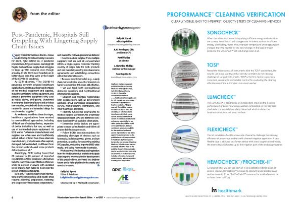 Healthcare Hygiene magazine is published monthly by Keystone Media Inc . 8955 Ridgeline Blvd ., Suite 500 , Highlands Ranch , CO 80129 . Free digital subscriptions available at www . healthcarehygienemagazine . com for U . S ., Canada and other foreign subscribers . Copyright © 2021 Keystone Media Inc . All rights reserved . The publisher reserves the right to accept or reject any advertising or editorial material . Advertisers , and / or their agents , assume the responsibility for all content of published advertisements and assume responsibility for any claims against the publisher based on the advertisement . Editorial contributors assume responsibility for their published works and assume responsibility for any claims against the publisher based on the published work . All items submitted to Healthcare Hygiene magazine become the sole property of Keystone Media Inc . Editorial content may not necessarily reflect the views of the publisher . No part of this publication may be reproduced in any form or by any electronic or mechanical means , including information storage and retrieval systems , without permission in writing from the publisher .