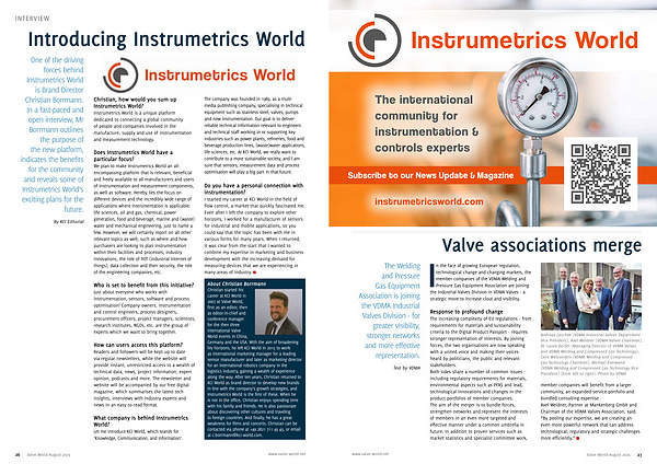 We plan to make Instrumetrics World an allencompassing platform that is relevant, beneficial and freely available to all manufacturers and users of instrumentation and measurement components, as well as software. Hereby lies the focus on different devices and the incredibly wide range of applications where instrumentation is applicable: life sciences, oil and gas, chemical, power generation, food and beverage, marine and( waste) water and mechanical engineering, just to name a few. However, we will certainly report on all other relevant topics as well, such as where and how purchasers are looking to plan instrumentation within their facilities and processes, industry innovations, the role of IIOT( industrial internet of things), data collection and their security, the role of the engineering companies, etc.