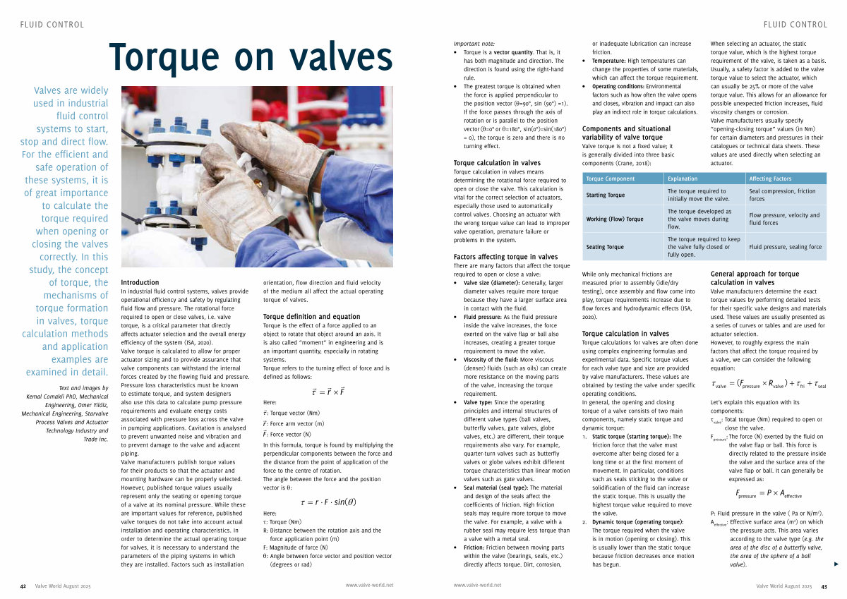 Valves are widely used in industrial fluid control systems to start, stop and direct flow. For the efficient and safe operation of these systems, it is of great importance to calculate the torque required when opening or closing the valves correctly. In this study, the concept of torque, the mechanisms of torque formation in valves, torque calculation methods and application examples are examined in detail.