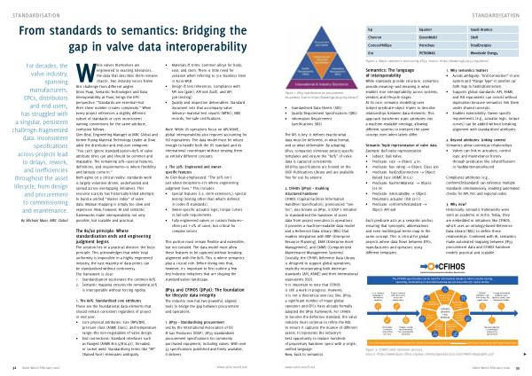 While valves themselves are engineered to exacting tolerances, the data that describes them remains chaotic. Two industry voices frame this challenge from different angles: Onno Paap, Semantic Technologies and Data Interoperability at Fluor, brings the EPC perspective:“ Standards are essential— but their sheer number creates complexity.” When every project references a slightly different subset of standards or uses inconsistent naming conventions for the same attribute, confusion follows. Glen Beal, Engineering Manager at MRC Global and former Piping Material Technology Leader at Dow, adds the distributor and end-user viewpoint:“ You can’ t ignore standardisation— 80 % of valve attribute titles can and should be common and mappable. The remaining 20 %— special features, definitions, and requirements— is where flexibility and latitude come in.” Both agree on a critical reality: standards work is largely volunteer-driven, underfunded and spread across overlapping initiatives. This resource scarcity has historically killed attempts to build a unified“ master index” of valve data. Manual mapping is simply too slow and expensive. Now, however, AI and semantic frameworks make interoperability not only possible, but scalable and practical.