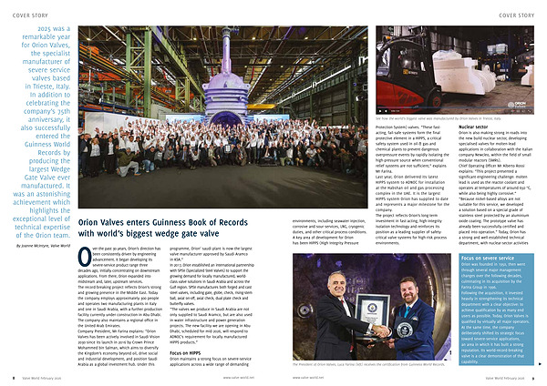 Orion was founded in 1950, then went through several major management changes over the following decades, culminating in its acquisition by the Farina Group in 1996. Following the acquisition, it invested heavily in strengthening its technical department with a clear objective: to achieve qualification by as many end users as possible. Today, Orion Valves is qualified by virtually all major operators. At the same time, the company deliberately shifted its strategic focus toward severe-service applications, an area in which it has built a strong reputation. Its world-record-breaking valve is a clear demonstration of that capability. π www. valve-world. net Valve World February 2026