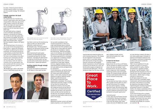 Sustainable growth In total, about 65 % of L & T Valves’ business is international, reflecting the company’ s successful global reach. With sales offices in key cities like Houston, Paris, Kuala Lumpur and across the Middle East, as well as a vast distributor network, L & T Valves is very clearly a global player. Yet despite its expansion, Mr Venkatesh emphasises that the company’ s commitment to engineering excellence and customer satisfaction remains unwavering.“ We’ re not just expanding for the sake of growth. Our goal is to continue to build a reputation for quality, reliability and performance, regardless of where we operate,” says Mr Venkatesh.“ We’ re working hard to be the partner of choice for industries that require the highest quality flow solutions- whether that’ s in energy, chemicals or infrastructure.” As L & T Valves prepares for the next phase of its journey, sustainability, digital transformation, and international expansion will remain at the forefront of its strategy. By integrating cutting-edge technology, implementing green manufacturing practices and growing its presence in key global markets, the company is positioning itself as a leader in the evolving world of flow control solutions.“ At the end of the day, we’ re a company built on trust, engineering excellence and a relentless drive to innovate,” Mr Venkatesh concludes.“ As we look to the future, we’ re confident that our growth will be both sustainable and profitable, for us and for our customers.” www. valve-world. net Valve World June 2025