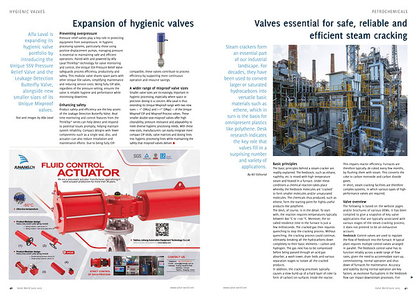 The following is based on the website pages and / or brochures of various OEMs. It has been compiled to give a snapshot of key valve applications that are typically associated with various stages of the steam cracking process; it does not pretend to be an exhaustive account. Feedstock: Control valves are used to regulate the flow of feedstock into the furnace. A typical plant requires multiple control valves arranged in parallel. The feedstock control valve has to function reliably across a wide range of flow rates, given the need to accommodate start-up, commissioning, normal operation and shutdown of furnaces for maintenance. Accuracy and stability during normal operation are key factors, as excessive fluctuations in the feedstock flow can impact downstream processes. Fire- π www. valve-world. net Valve World June 2025