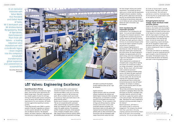 L & T Valves is known as a manufacturer of gate, globe, check and ball valves approved by the global energy majors. They built a reputation as a reliable supplier of valves for oil & gas, refining and thermal power projects and plants across the world. And to address the evolving requirements of its core customers, L & T Valves has been aggressively expanding its product portfolio.“ Triple-offset butterfly valve( TOBV) is a perfect example of how we’ re upgrading our products to meet customer demands for more efficient and cost-effective solutions,” Mr Venkatesh explains. L & T Valves’ expertise in TOBV design and manufacturing is recognised across industries, and the company offers custom-engineered solutions for mission-critical services.“ We’ ve manufactured TOBVs in sizes up to 100 inches, and cryogenic variants for LNG terminals and plants. We are confident we will soon be able to increase our impact and market share in the global butterfly market.” Another area of innovation is smart automation.“ We see an increased demand for automated valves, and we leverage our expertise in system design and integration to offer a comprehensive range of SIL-capable solutions. The automation portfolio includes on-off valves, remote-operated valves, emergency shutdown valves, as well as High Integrity Pressure Protection Systems( HIPPS). By embedding digital and automation technology,