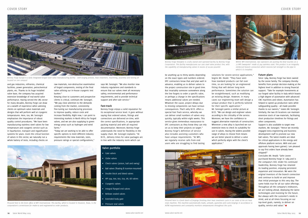 and gas industries, refineries, chemical facilities, power generation, petrochemical plants, etc. Thanks to its huge installed valve base, the company has acquired extensive knowledge of real-world valve performance. Having served the LNG sector for many decades, Bonney Forge can draw on a wealth of experience when advising clients on optimum valve materials and designs that will perform well at cryogenic temperatures. Here, too, Mr. Sonzogni emphasises the importance of robust quality control procedures.“ We have been manufacturing stainless steel valves for low temperature and cryogenic service such as in liquefaction, transport and regasification systems for years. Given the critical function of valves in this sector, we naturally run a whole battery of tests, including checks on raw materials, non-destructive examination of forged components, testing of the final valve utilising our in-house cryogenic test bunker.” Keeping close to customers and prospective clients is critical, continues Mr. Sonzogni.“ We pay close attention to the demands coming from the market, consistently fine-tuning our manufacturing processes to improve quality, reduce costs and increase flexibility. Right now, I can point to interesting markets in North Africa for forged valves, and we are also supplying to green energy areas such as hydrogen and wind farms.”“ Today we are working to be able to offer specific options to meet different industry requirements like new materials, sizes, pressure ratings or special configurations,” says Mr. Sonzogni.“ We also monitor new industry regulations and standards to ensure that our valves meet all necessary safety, environmental and performance requirements, and to provide technical support and after-sale service.”