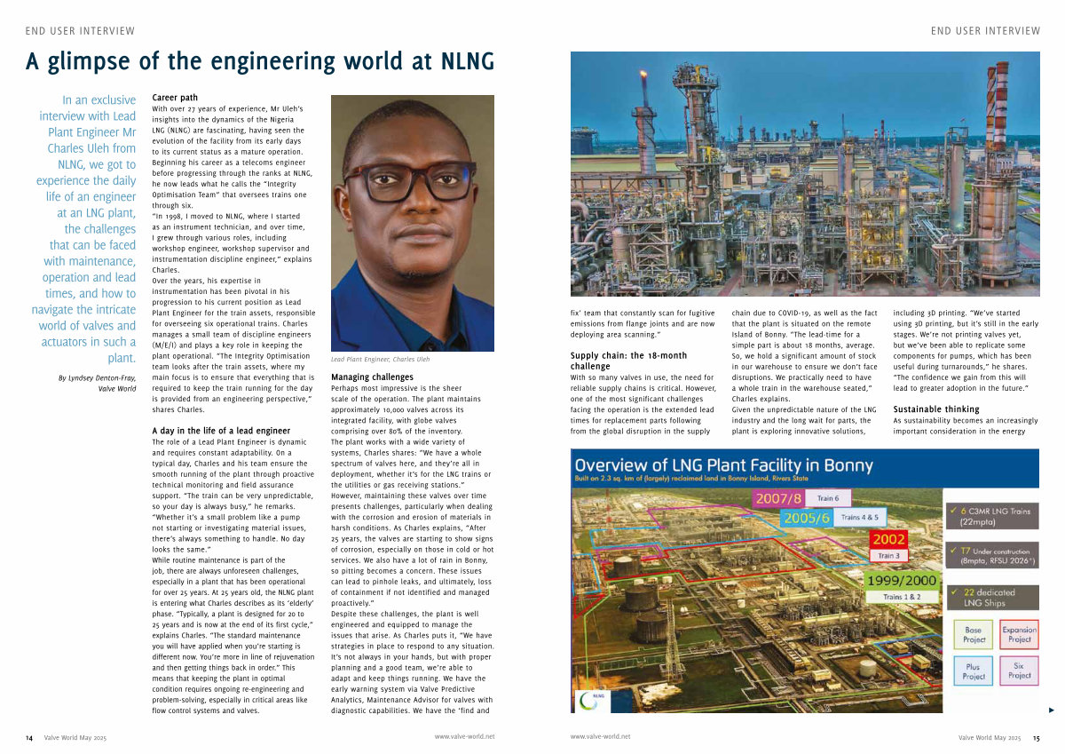 chain due to COVID-19, as well as the fact that the plant is situated on the remote Island of Bonny.“ The lead-time for a simple part is about 18 months, average. So, we hold a significant amount of stock in our warehouse to ensure we don’ t face disruptions. We practically need to have a whole train in the warehouse seated,” Charles explains. Given the unpredictable nature of the LNG industry and the long wait for parts, the plant is exploring innovative solutions, including 3D printing.“ We’ ve started using 3D printing, but it’ s still in the early stages. We’ re not printing valves yet, but we’ ve been able to replicate some components for pumps, which has been useful during turnarounds,” he shares.“ The confidence we gain from this will lead to greater adoption in the future.”
