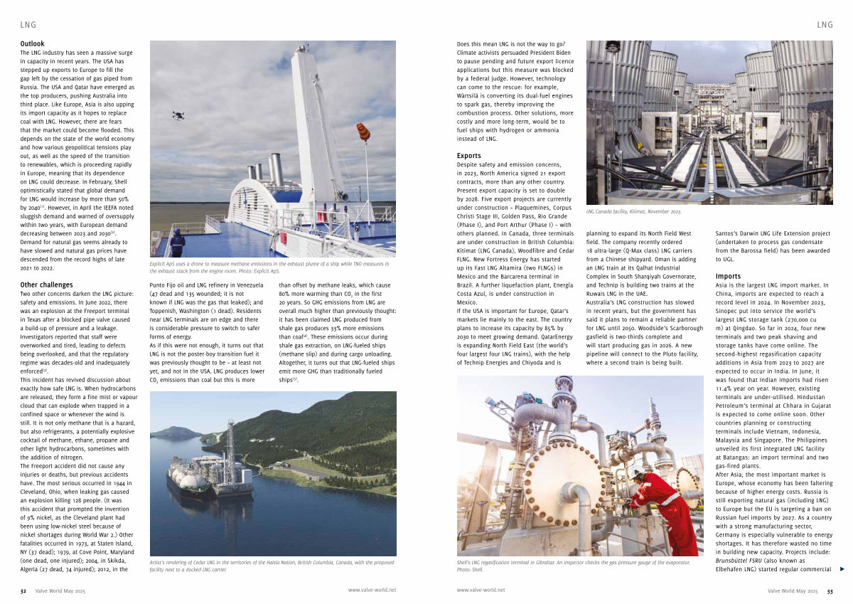 Two other concerns darken the LNG picture: safety and emissions. In June 2022, there was an explosion at the Freeport terminal in Texas after a blocked pipe valve caused a build-up of pressure and a leakage. Investigators reported that staff were overworked and tired, leading to defects being overlooked, and that the regulatory regime was decades-old and inadequately enforced( 3). This incident has revived discussion about exactly how safe LNG is. When hydrocarbons are released, they form a fine mist or vapour cloud that can explode when trapped in a confined space or whenever the wind is still. It is not only methane that is a hazard, but also refrigerants, a potentially explosive cocktail of methane, ethane, propane and other light hydrocarbons, sometimes with the addition of nitrogen. The Freeport accident did not cause any injuries or deaths, but previous accidents have. The most serious occurred in 1944 in Cleveland, Ohio, when leaking gas caused an explosion killing 128 people.( It was this accident that prompted the invention of 9 % nickel, as the Cleveland plant had been using low-nickel steel because of nickel shortages during World War 2.) Other fatalities occurred in 1973, at Staten Island, NY( 37 dead); 1979, at Cove Point, Maryland( one dead, one injured); 2004, in Skikda, Algeria( 27 dead, 74 injured); 2012, in the
