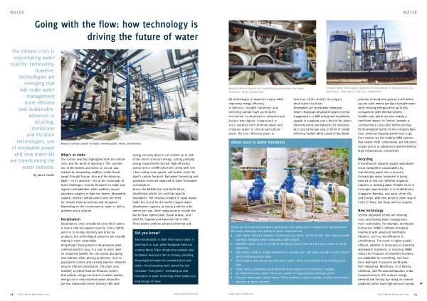 Several important trends are reducing costs and making water management more sustainable. For example, membrane bioreactors( MBRs) combine biological treatment with advanced membrane filtration, such as microfiltration or ultrafiltration. The result is higher-quality effluent, whether in municipal or industrial wastewater treatment, or recycling. MBRs reduce the footprint of treatment facilities, are adaptable for retrofitting, and have been deployed in projects world-wide, from Owatonna, Minnesota, to St Helena, California, and Thiruvananthapuram, India. Forward osmosis( FO) reduces energy demand and fouling by relying on osmotic gradients rather than high-pressure pumps. π www. valve-world. net Valve World November 2025 15