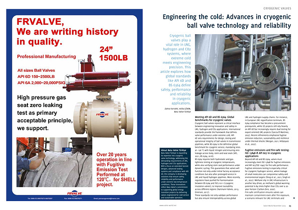 About Batu Valve Türkiye Batu Valve Türkiye is expanding its expertise into cryogenic valve technology, addressing the demanding requirements of LNG, hydrogen and CO2 applications. With a focus on extended bonnet designs, advanced sealing systems and compliance with API 6D, the company is developing solutions that ensure safety, reliability and performance under extreme low-temperature conditions. These innovations reflect Batu Valve’ s commitment to supporting global energy transition projects by delivering valves engineered for cold service and sustainable operation. |