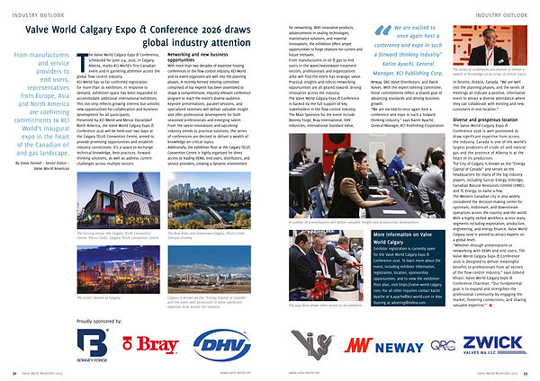 The Valve World Calgary Expo & Conference, scheduled for June 3-4, 2026, in Calgary, Alberta, marks KCI World’ s first Canadian event and is garnering attention across the global flow control industry. KCI World has so far confirmed registration for more than 70 exhibitors. In response to demand, exhibition space has been expanded to accommodate additional international exhibitors. This not only reflects growing interest but unlocks new opportunities for collaboration and business development for all participants. Presented by KCI World and Messe Düsseldorf North America, the Valve World Calgary Expo & Conference 2026 will be held over two days at the Calgary TELUS Convention Centre, aimed to provide promising opportunities and establish industry connections. It’ s a space to exchange technical knowledge, best practices, forwardthinking solutions, as well as address current challenges across multiple sectors.