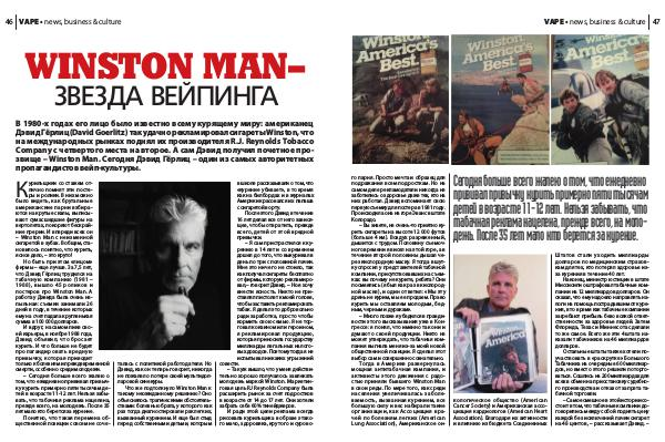 В 1980-х годах его лицо было известно всему курящему миру: американец Дэвид Гёрлиц( David Goerlitz) так удачно рекламировал сигареты Winston, что на международных рынках поднял их производителя R. J. Reynolds Tobacco Company с четвертого места на второе. А сам Дэвид получил почетное прозвище – Winston Man. Сегодня Дэвид Гёрлиц – один из самых авторитетных пропагандистов вейп-культуры.