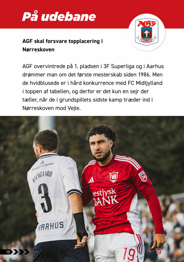 AGF overvintrede på 1. pladsen i 3F Superliga og i Aarhus drømmer man om det første mesterskab siden 1986. Men de hvidblusede er i hård konkurrence med FC Midtjylland i toppen af tabellen, og derfor er det kun en sejr der tæller, når de i grundspillets sidste kamp træder ind i Nørreskoven mod Vejle.
