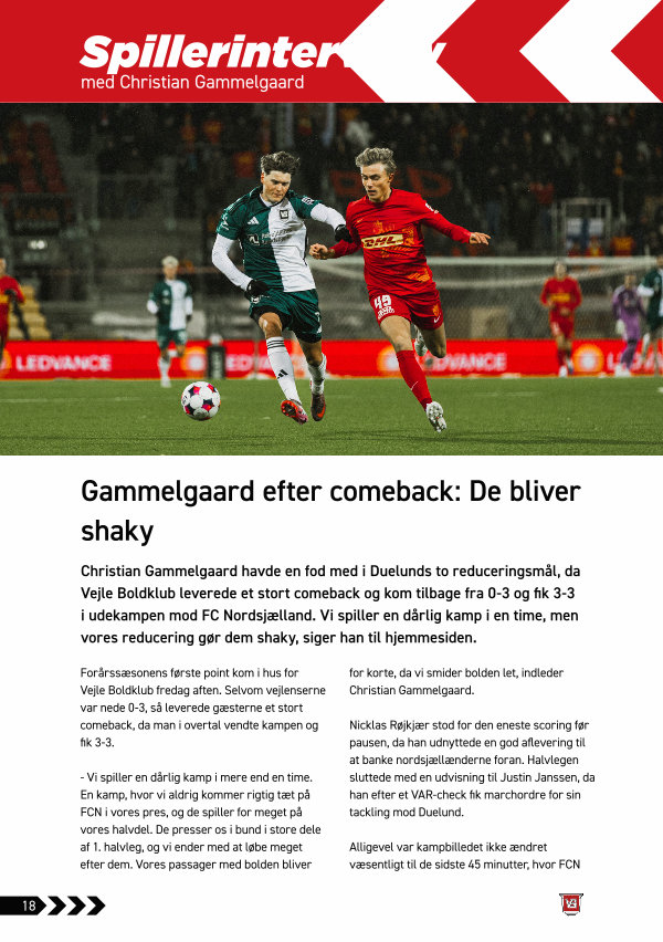 Christian Gammelgaard havde en fod med i Duelunds to reduceringsmål, da Vejle Boldklub leverede et stort comeback og kom tilbage fra 0-3 og fik 3-3 i udekampen mod FC Nordsjælland. Vi spiller en dårlig kamp i en time, men vores reducering gør dem shaky, siger han til hjemmesiden.